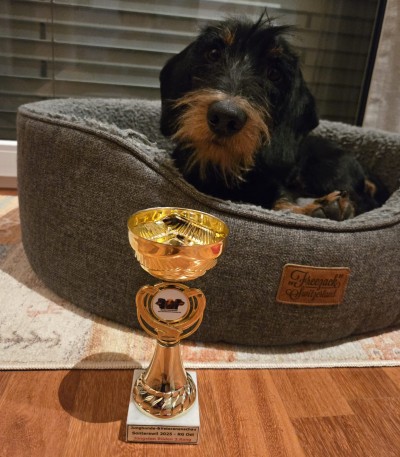 Er hat einen erfreulichen Bericht mit nach Hause gebracht: 9 Monate alter Rauhaarstandard- Rüde schwarz-rot, korrekt angesetzte und getragene Behänge, vollzähliges Scherengebiss, vorzügliche obere und untere Linie, korrekt gewinkelt,vorzüglich aufgerippt, schon jetzt vorzügliches Haar, Vorder- und Hinterhand prallel geführt, Brustumfang 42 cm, in der Entwicklung stehender Rüde, freundliches Verhalten, ich wünschte etwas mehr Schub, Rute korrekt. Vielversprechend 1
