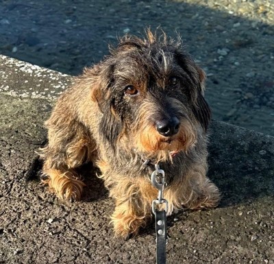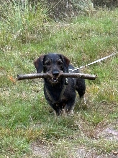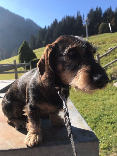 Er hat einen erfreulichen Bericht mit nach Hause gebracht: 9 Monate alter Rauhaarstandard- Rüde schwarz-rot, korrekt angesetzte und getragene Behänge, vollzähliges Scherengebiss, vorzügliche obere und untere Linie, korrekt gewinkelt,vorzüglich aufgerippt, schon jetzt vorzügliches Haar, Vorder- und Hinterhand prallel geführt, Brustumfang 42 cm, in der Entwicklung stehender Rüde, freundliches Verhalten, ich wünschte etwas mehr Schub, Rute korrekt. Vielversprechend 1